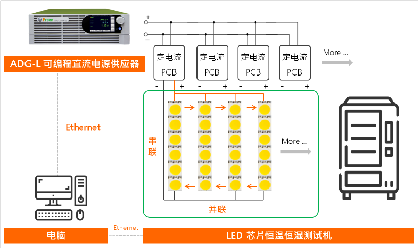 我們使用ADG-L可編程直流電源,進行LED產品老化測試。透過遠程計算機, 以Ethernet通訊方式,鏈接恒溫恒濕測試機內串并接好的LED 芯片模塊,提供每個芯片穩定的電壓及電流。