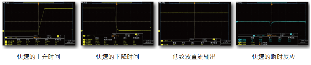 ? 瞬時反應與開關機時間測試:以低紋波、高精度、高穩壓率的特性,搭配快速的反應速度和爬升率,適合高效率地模擬各種直流電源測試。