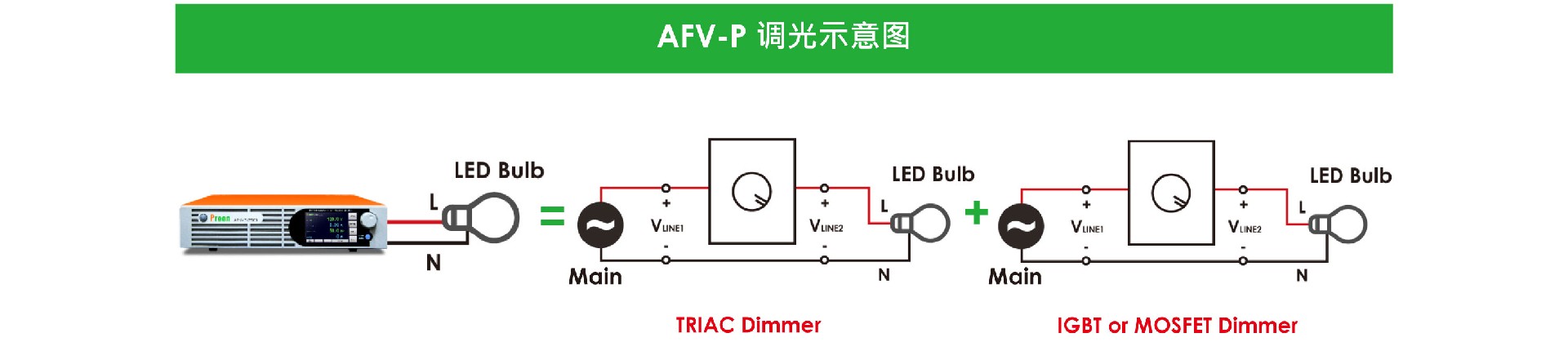 Preen的 AFV-P是一款輸出可達2000 Hz,并兼具交流輸出以及直流輸出的測試電源產品。內建的 「相位角調光」 功能,可達到TRIAC與IGBT等調光器的效能來模擬前沿調光與后沿調光,適用于IEC60598-1, GB7000.1, CNS14335 等相關標準法規的驗證,透過電壓相位的變化來改變輸出端通過LED燈的電流,借此達到調整LED燈不同亮度的測試目的。